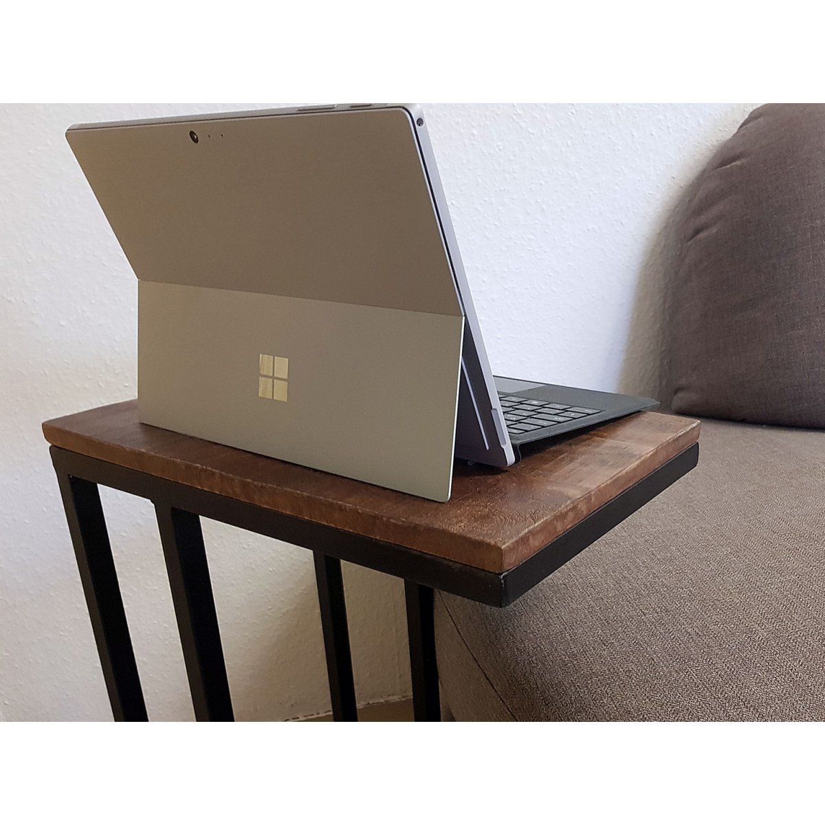 Deze bijzettafel is een multifunctioneel bijzettafeltje dat perfect dienst doet als laptop-, bank- of banktafel. Het tafelblad is gemaakt van duurzaam gerecycled hout met een karakteristiek ongelijk oppervlak, rustend op een stevig, roestvrij metalen frame. Dit frame is in mat zwart en heeft de volgende afmetingen: breedte 25 cm, hoogte 61 cm en diepte 40 cm. De tafel is ontworpen in een praktische C-vorm, waardoor de poten gemakkelijk onder een bank of bed kunnen worden geschoven.