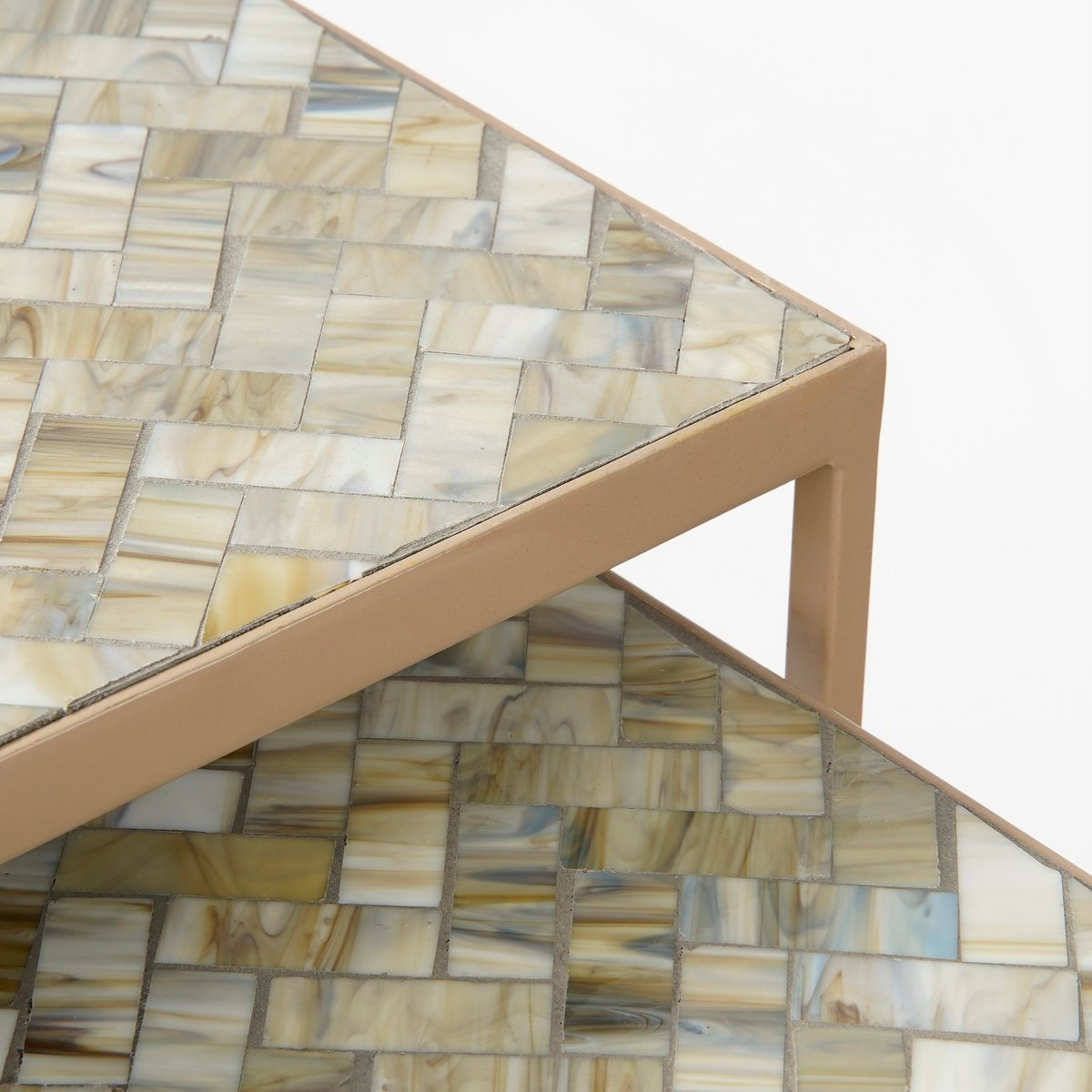 De stijlvolle bijzettafels van Mica Decorations wil je echt hebben. De bijzettafels komen in een set van 2 en hebben minimalistische, taupekleurige poten die per tafel met elkaar verbonden zijn. De grijze tegelwerkjes op de tafelbladen zijn een kunstwerk om naar te kijken. De combinatie van de kleuren taupe en grijs maakt het echt een blikvanger voor op je balkon, in je tuin of zelfs in je interieur. Daarnaast kun je deze tafels in elkaar schuiven waardoor je ruimte kunt besparen of maken. Ideaal! Het materiaal van de tafelpoten is metaal en de tegels zijn van gekleurd glas. De afmetingen van de tafels zijn L38 x B38 x H48 cm en L32 x B32 x H43 cm.