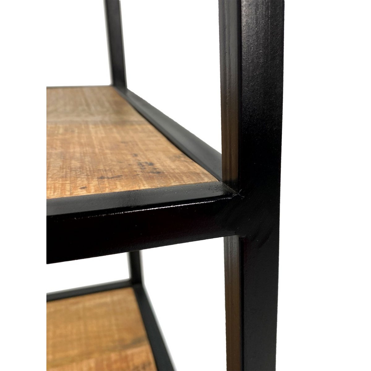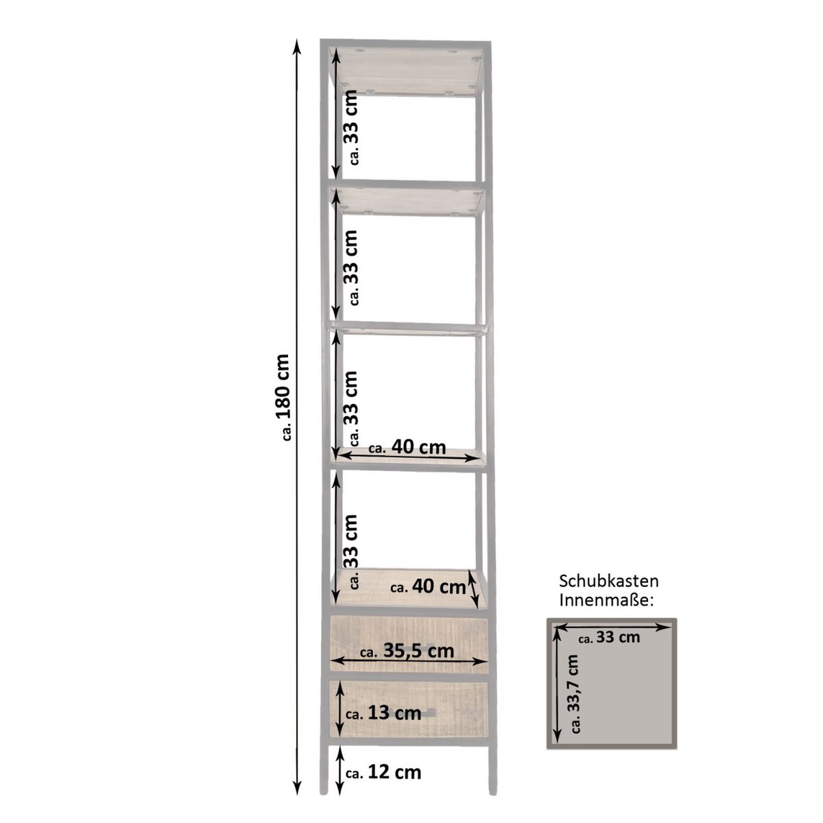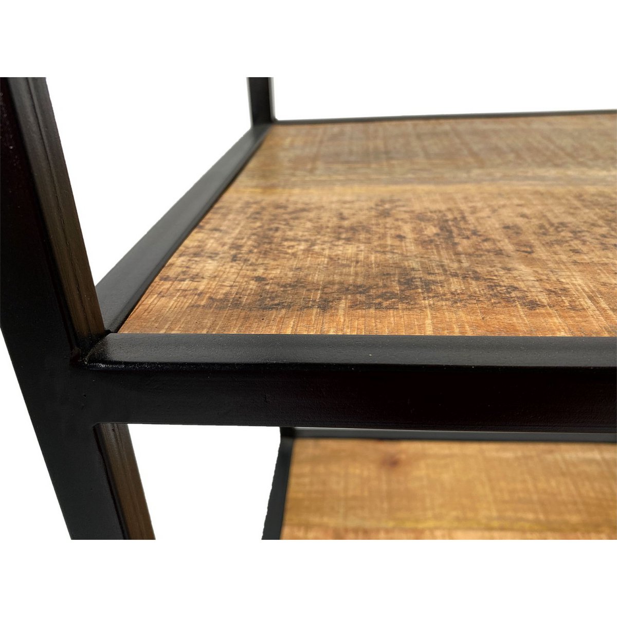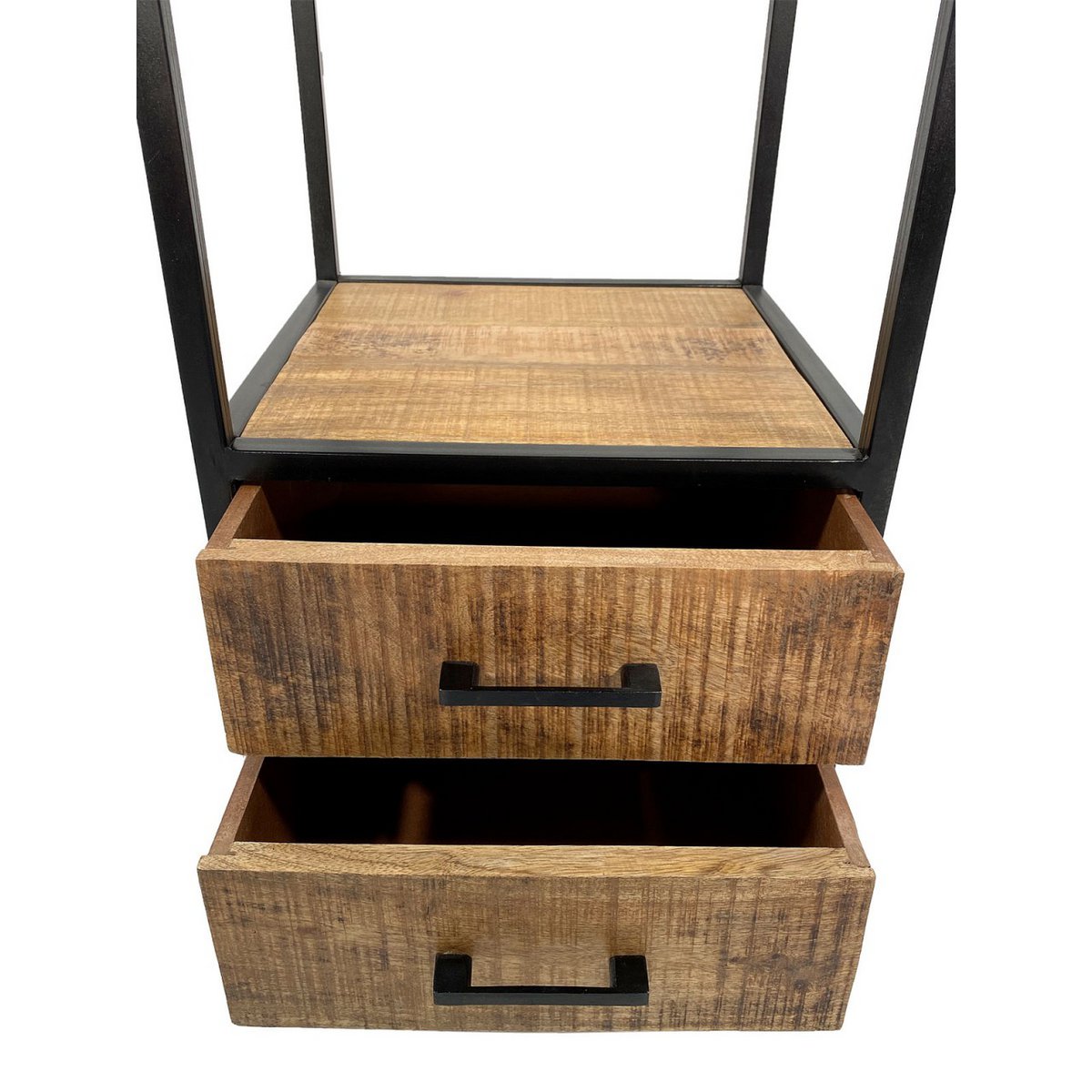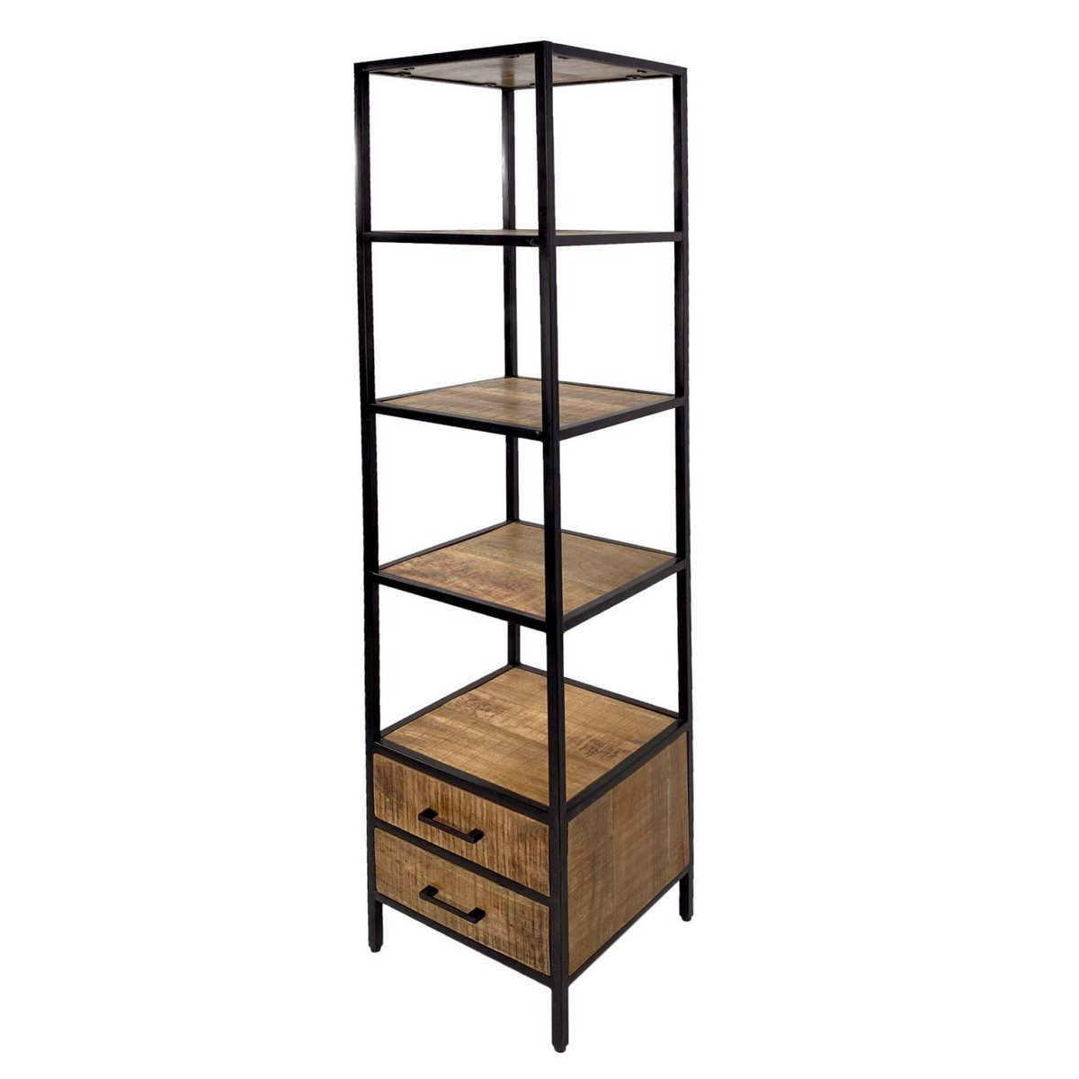 Staande boekenkast of wandkast met 4 planken en 2 laden gemaakt van gerecycled mangohout en een stevig metalen frame van de kleur Tabacco. De moderne mix van oud mangohout en een zeer stabiele frameconstructie geeft een warme look aan uw interieur.