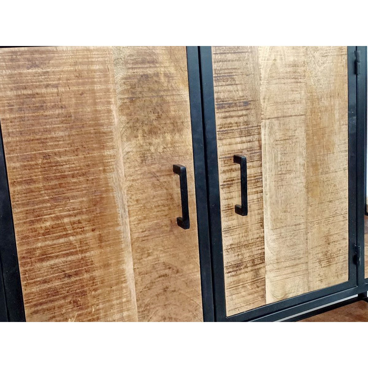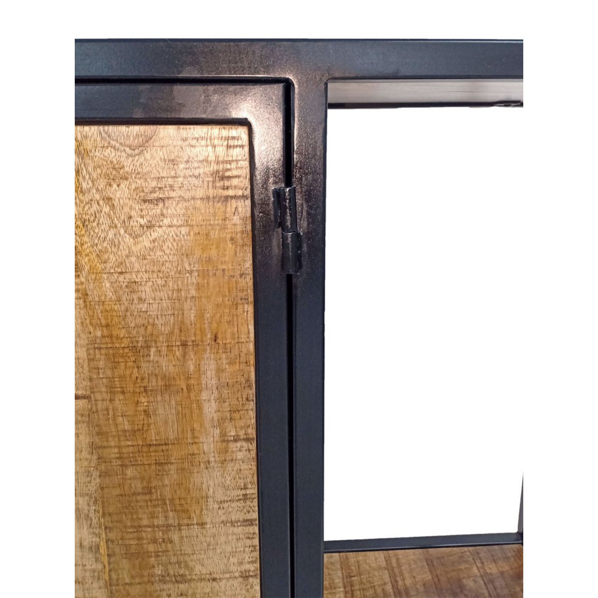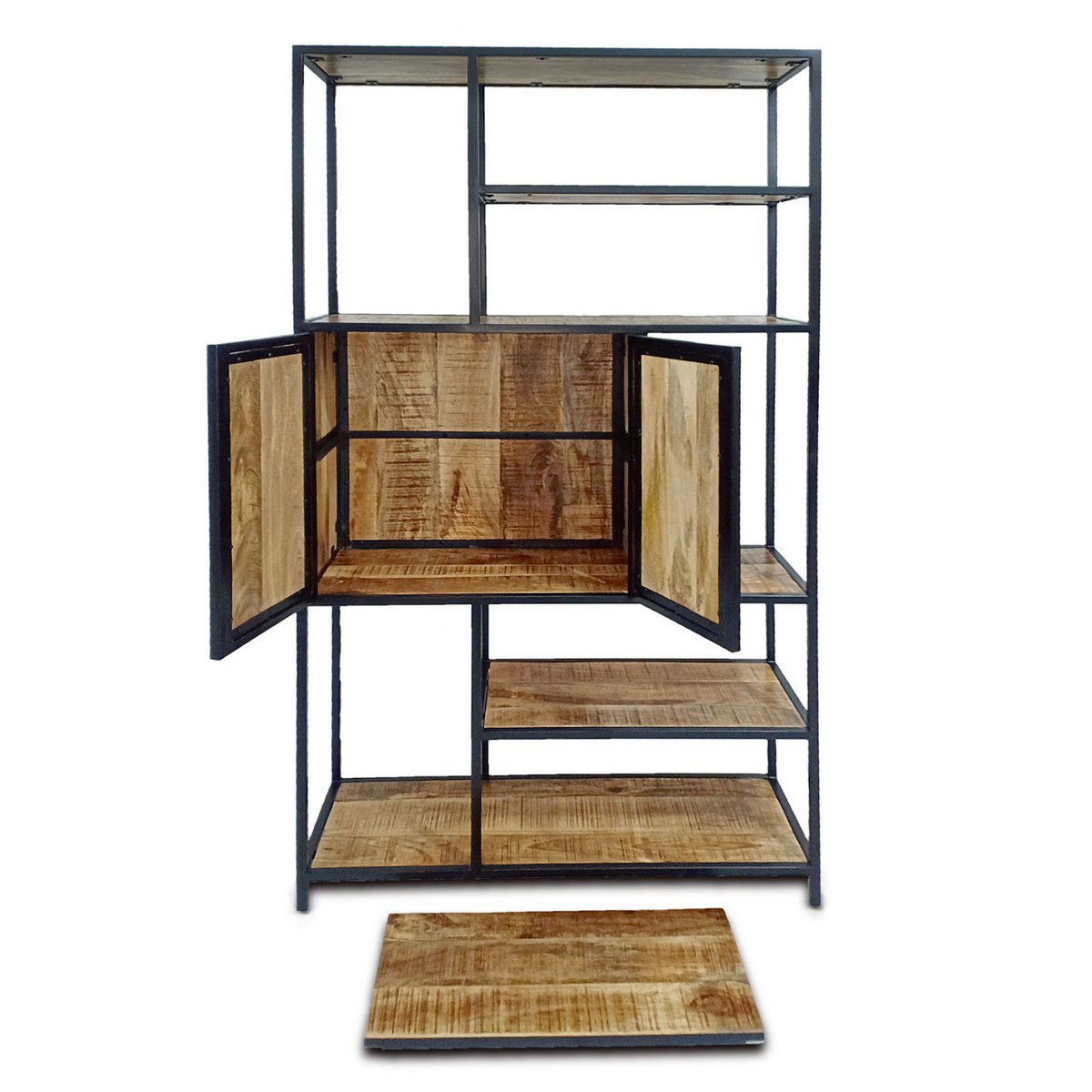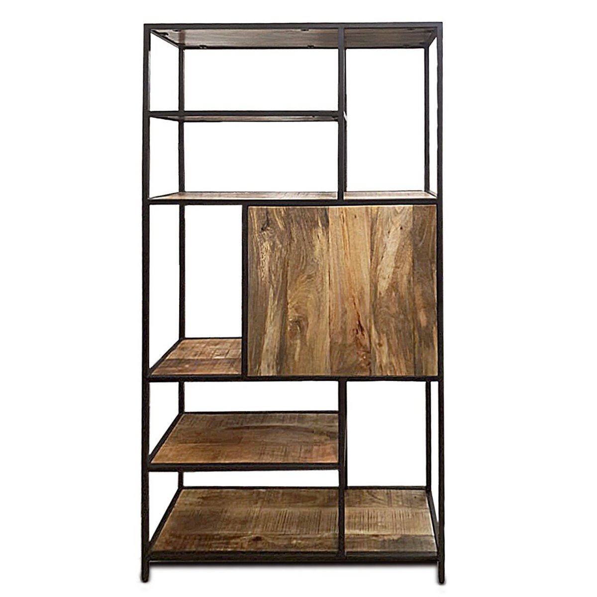 Boekenkast met 6 planken en 1 kastcompartiment gemaakt van gerecycled afvalhout met zaag- en slijtages. Frame gemaakt van robuuste zwarte rijstrookbuizen in mat zwart. Een moderne mix van massief mangohout en een zeer stabiel metalen frame.