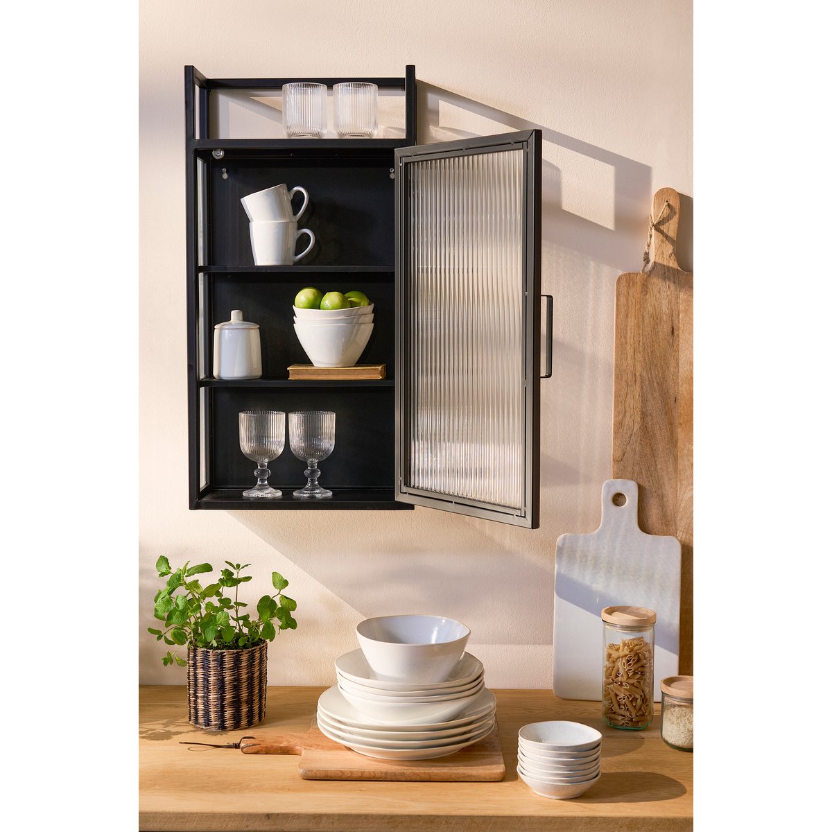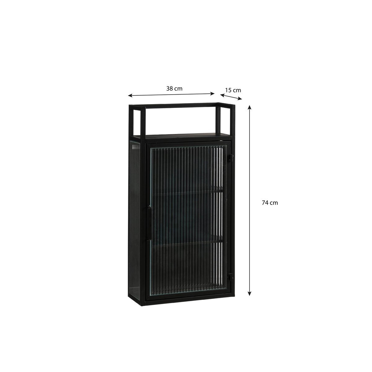 De Clifton wandkast van Mica Decorations is een stijlvolle opbergkast met een moderne twist! De Clifton is gemaakt van stevig metaal in een zwarte kleur en een glazen paneeldeur met een geribbeld design - helemaal volgens de laatste trend, en ideaal om spullen netjes op te bergen. Of je nu op zoek bent naar een kleine servieskast voor in de keuken, een stijlvolle opbergoplossing voor de badkamer of een uniek meubelstuk voor de woonkamer, deze kast past overal. Hij heeft een lengte van 38 cm, een breedte van 15 cm en een hoogte van 74 cm.