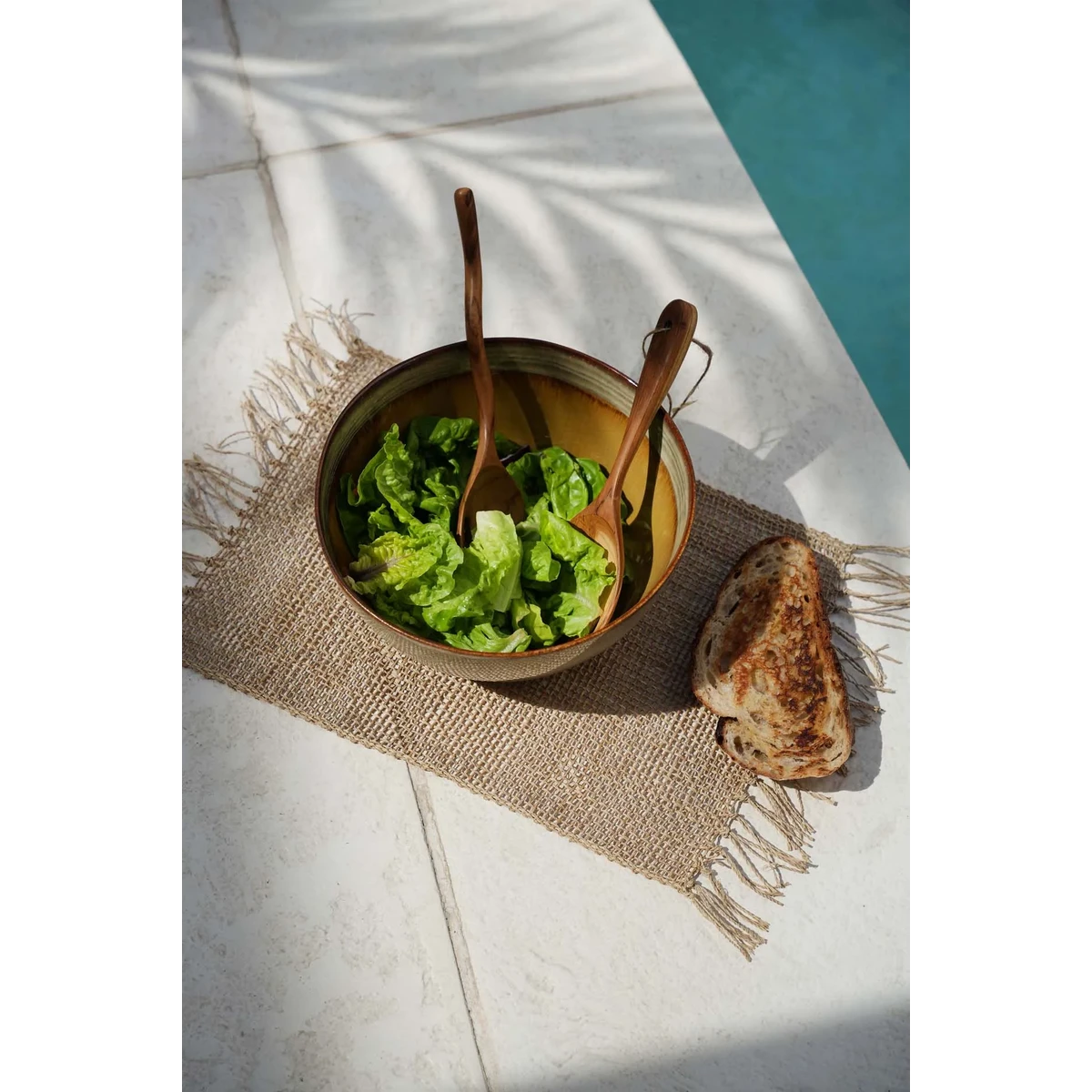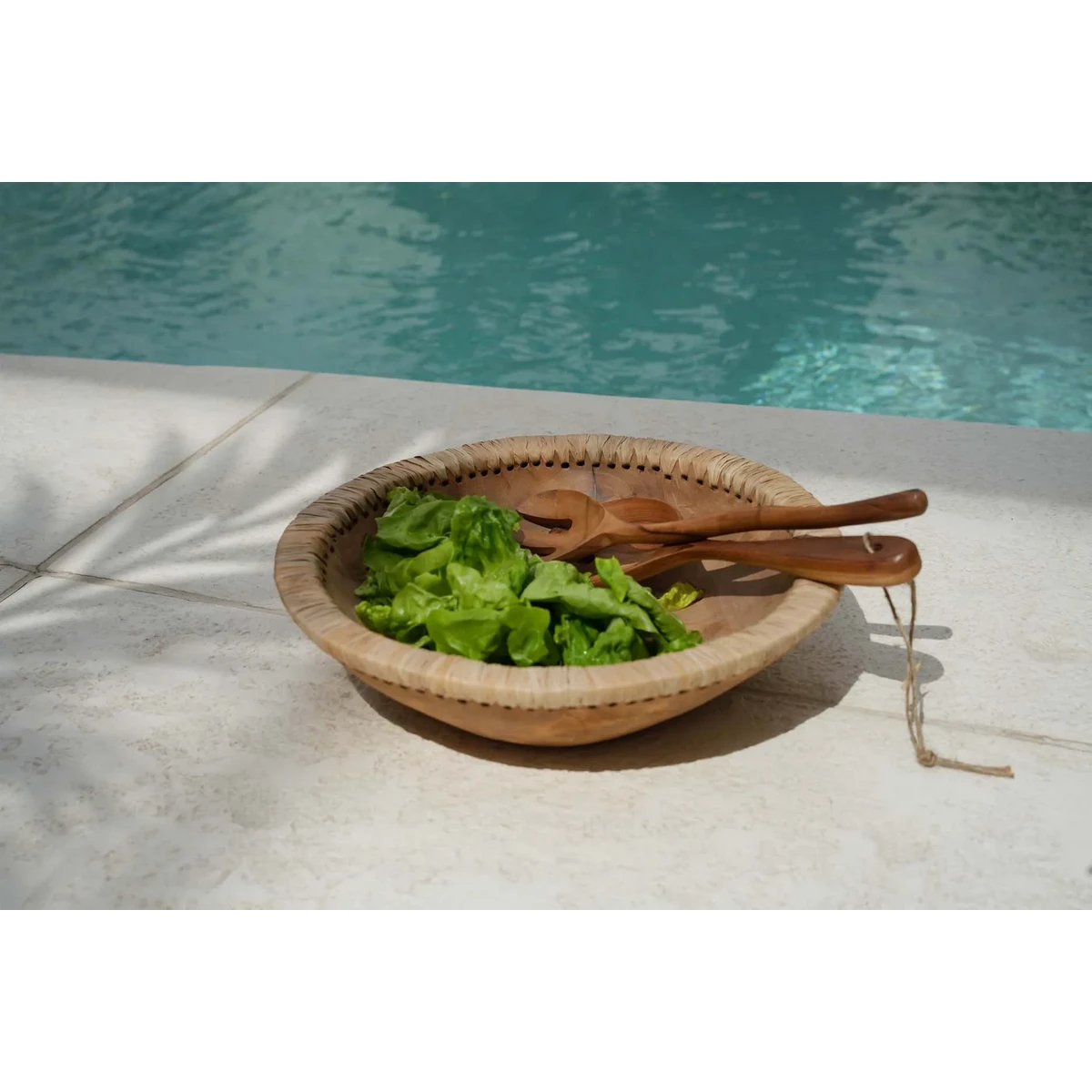 Voeg een vleugje kunstzinnigheid toe aan uw eetervaring met de Twisted Salad Fork, handgemaakt van rijk teakhout. Het elegante, gedraaide handvat getuigt niet alleen van deskundig vakmanschap, maar biedt ook een comfortabele grip, waardoor het perfect is voor het gooien en serveren van allerlei soorten salades, van knapperige groenten tot pittige pastamixen.