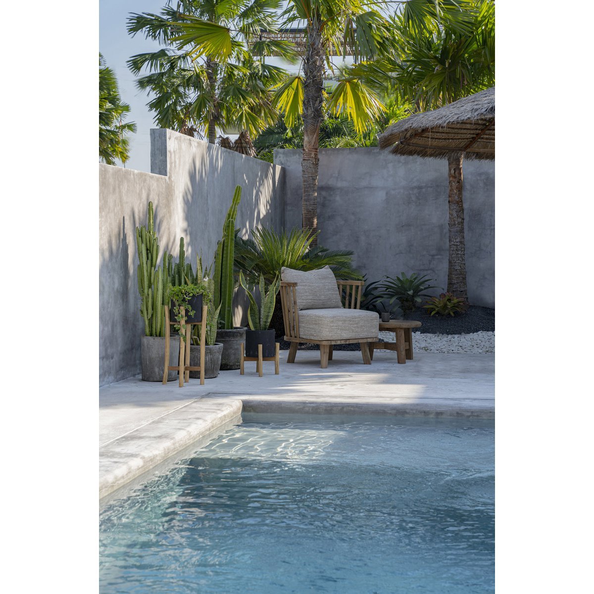 De gulle zitplaats en het sculpturale frame creëren een statement -stuk dat net zo comfortabel is als verfijnd. De stevige teruggewonnen teakconstructie zorgt voor duurzaamheid, terwijl de natuurlijke witte afwerking een zacht, eigentijds karakter toevoegt dat de sfeer van woonkamers, lounges of boetiekprojecten verbetert.
