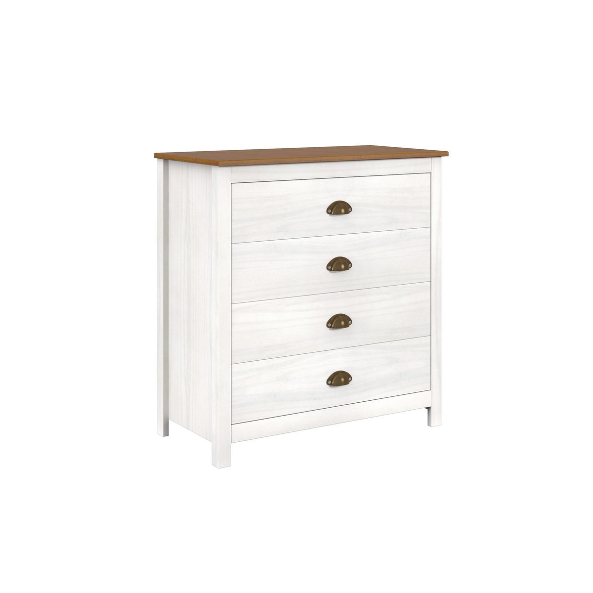 Deze functionele ladekast in tijdloze landhuisstijl biedt veel opbergruimte met 4 lades met metalen uittrekelementen. Zo creëer je gemakkelijk orde in je woonkamer, slaapkamer of entree. De rustiek witte afwerking van de romp geeft de ladekast een bijzonder karakteristieke uitstraling. De ladekast is gemaakt van massief grenenhout en is bijzonder robuust. Het kastmeubel wordt visueel afgerond met een bruine afdekplaat en messingkleurige schelpgrepen. Als je van de rustieke, gezellige landelijke stijl houdt en je spullen graag goed opgeborgen houdt, dan is deze praktische ladekast de juiste keuze.