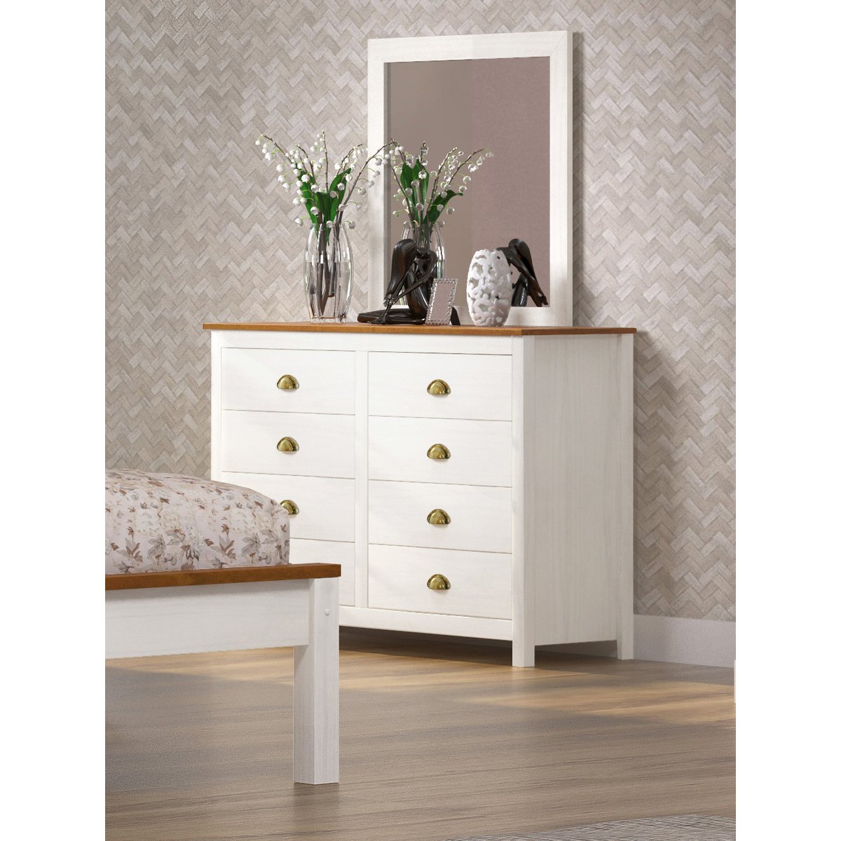Deze ladekast is een solide en kwalitatief hoogstaand product gemaakt van massief grenen. De ladekast is wit geverfd met een bruine bovenplaat. In 8 lades op metalen geleiders en met metalen handgrepen biedt hij ruimte voor wasgoed, handschoenen of andere spullen.