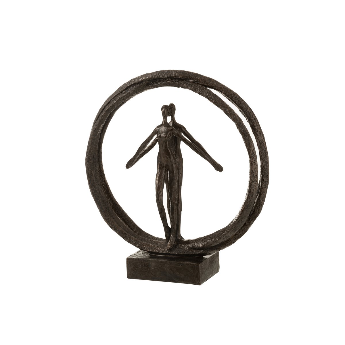 De “Koppel In Dubbele Cirkel” van J-Line toont twee figuren, liefdevol verbonden binnen twee in elkaar grijpende cirkels – een krachtig symbool van eenheid, loyaliteit en harmonie. Uitgevoerd in donkerbruin polyresin straalt het beeld warmte en elegantie uit, passend in elk stijlvol interieur. Een bijzonder en betekenisvol cadeautje voor mensen die weten dat liefde sterker wordt wanneer je samen blijft draaien.