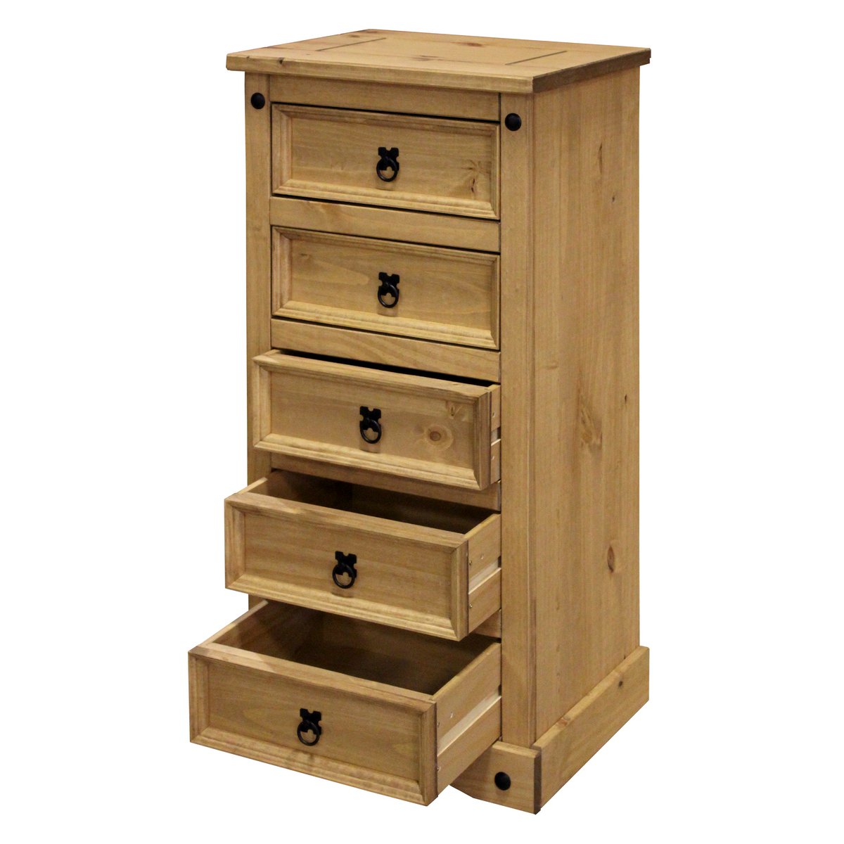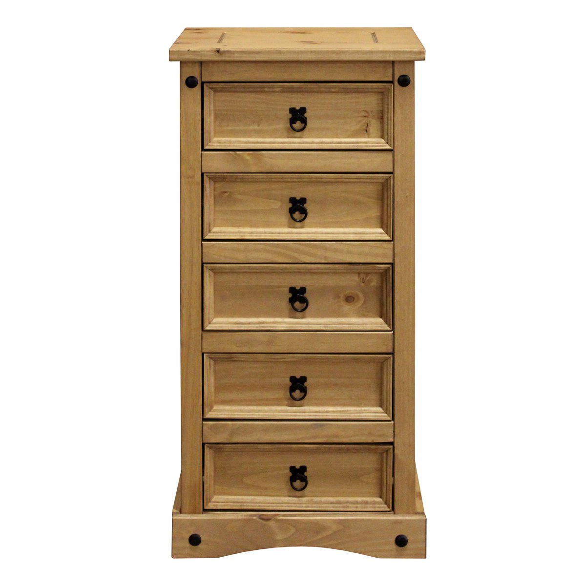 Deze sfeervolle ladekast van massief grenenhout is een echt pareltje voor je huis. Met vijf royale lades biedt hij niet alleen praktische opbergruimte, maar geeft hij je kamer ook een vleugje rustieke flair. De ladekast is gemaakt van hoogwaardig grenenhout en overtuigt door zijn natuurlijke schoonheid en robuustheid. Het oppervlak heeft een warme, natuurlijke wastint die de unieke nerf van het hout benadrukt en uw kamer een gezellige sfeer geeft. Zwart metalen beslag zorgt voor stijlvolle accenten en geeft de ladekast een tijdloze charme. De vijf ruime lades bieden voldoende ruimte voor kleding, accessoires, boeken of andere persoonlijke spullen. Dankzij de stabiele constructie en de hoogwaardige afwerking kun je rekenen op een lange levensduur en een eenvoudige bediening van de lades. met zwart metalen beslag