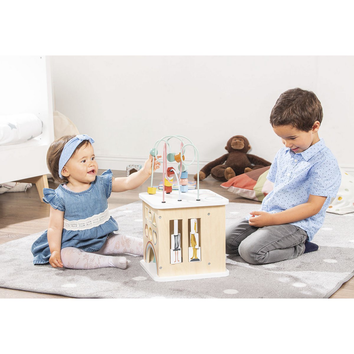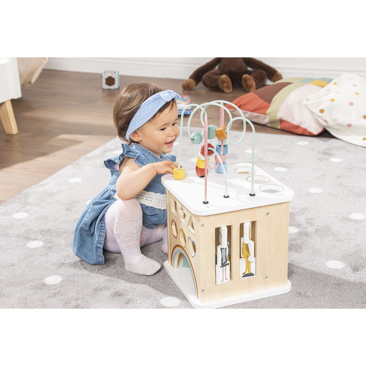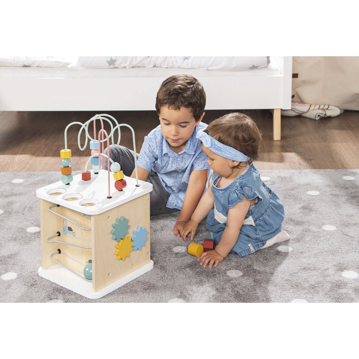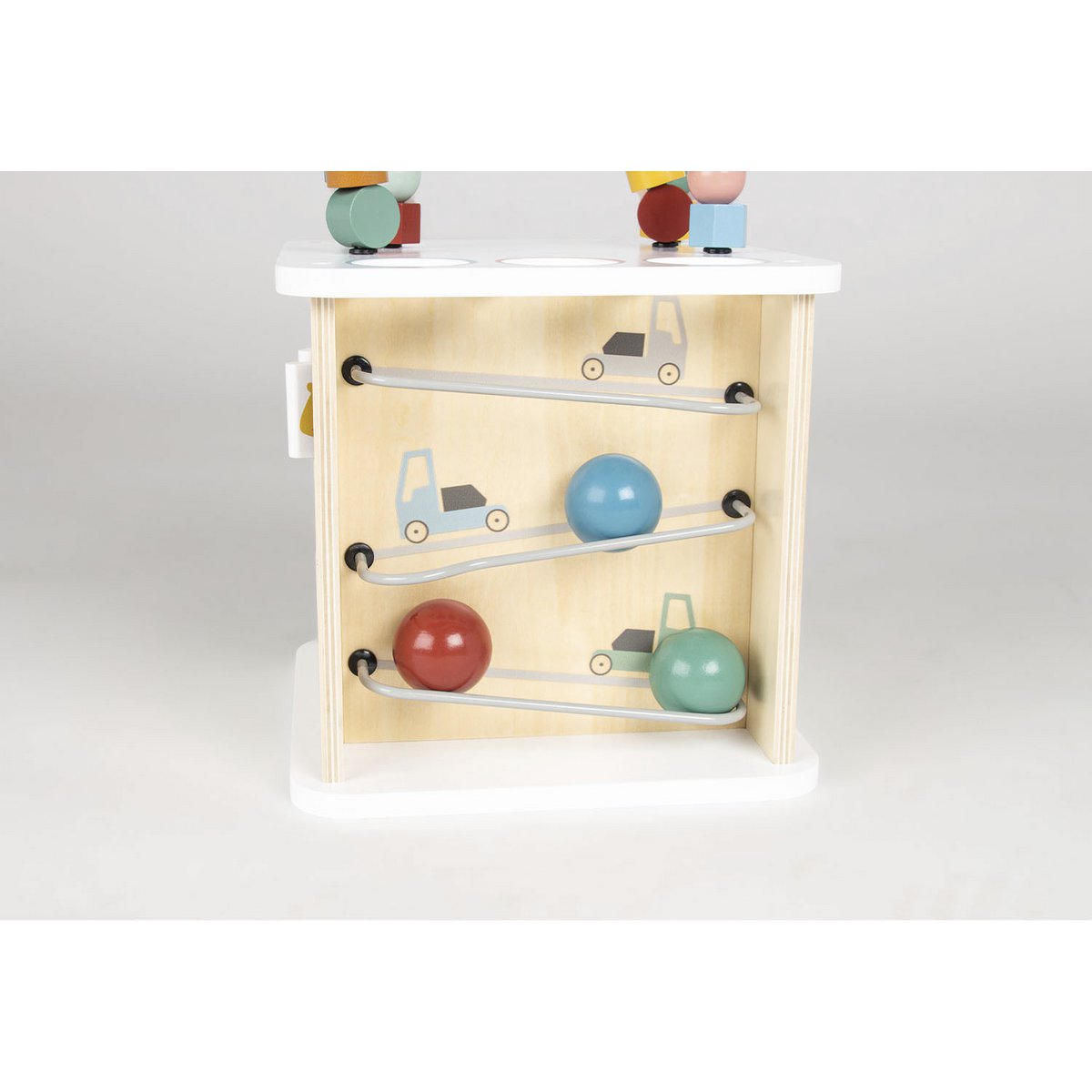 • 10 delen: 1 motorische kubus, 3 knikkers (Ø 46 mm), 6 vormblokken