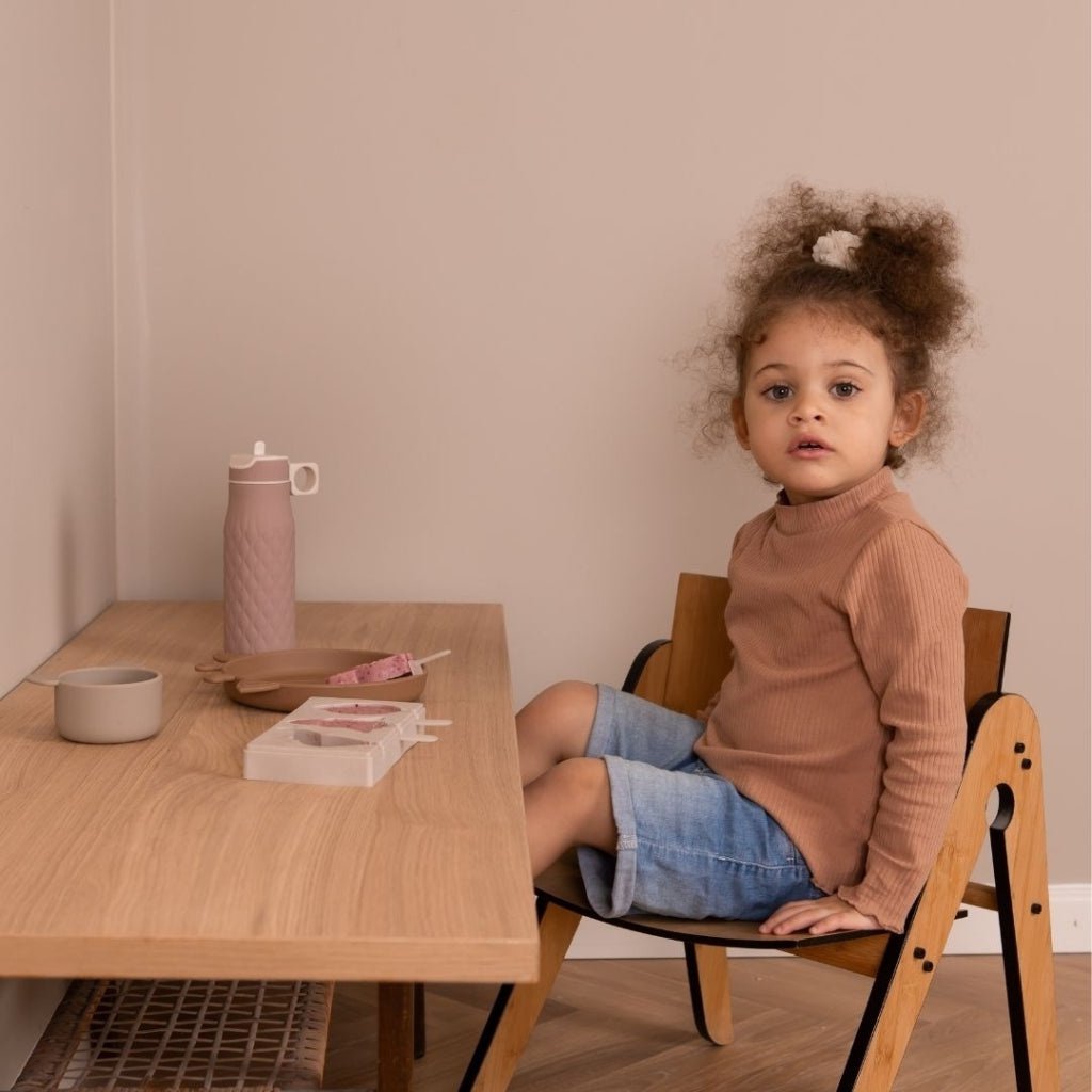 De schattige Nima drinkfles is gemaakt van 100% LFGB-siliconen, vrij van schadelijke chemicaliën en goedgekeurd voor voedsel. Het deksel is gemaakt van plastic zonder ftalaten en past goed op de fles.