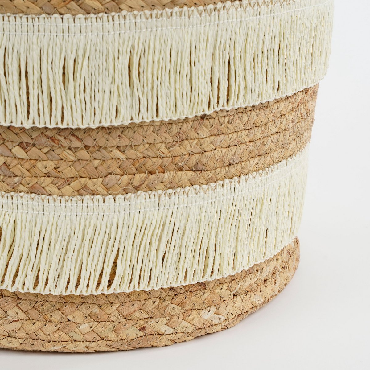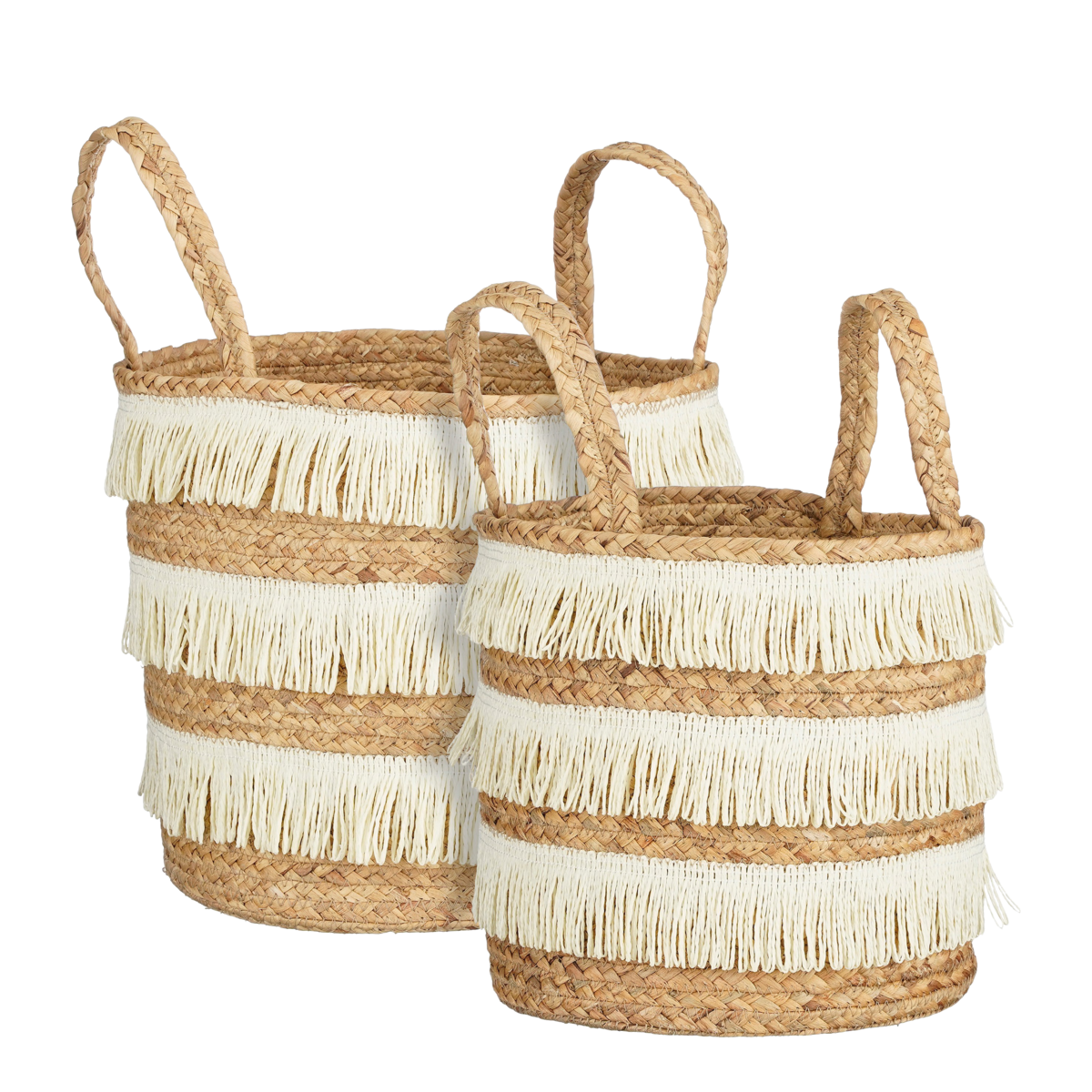 Breng warmte en rust in huis met deze stijlvolle set opbergmanden. De manden zijn met de hand gevlochten van natuurlijke waterhyacint. Ze hebben een warme, bruine kleur die goed past in een boho- of mediterraan interieur. De witte franjes geven een speelse, zomerse uitstraling — precies goed voor dat ontspannen Ibiza-gevoel. Gebruik ze in de woonkamer voor plaids en tijdschriften, in de slaapkamer voor sierkussens, of in de hal voor handschoenen en sjaals. Dankzij de stevige handvatten verplaats je ze makkelijk naar een andere ruimte. De set bevat twee maten: groot (H30 x Ø32 cm) en klein (H27 x Ø28 cm). Zo berg je alles stijlvol én sfeervol op. Voeg ze toe aan je interieur en geef je huis een zomerse strandsfeer!