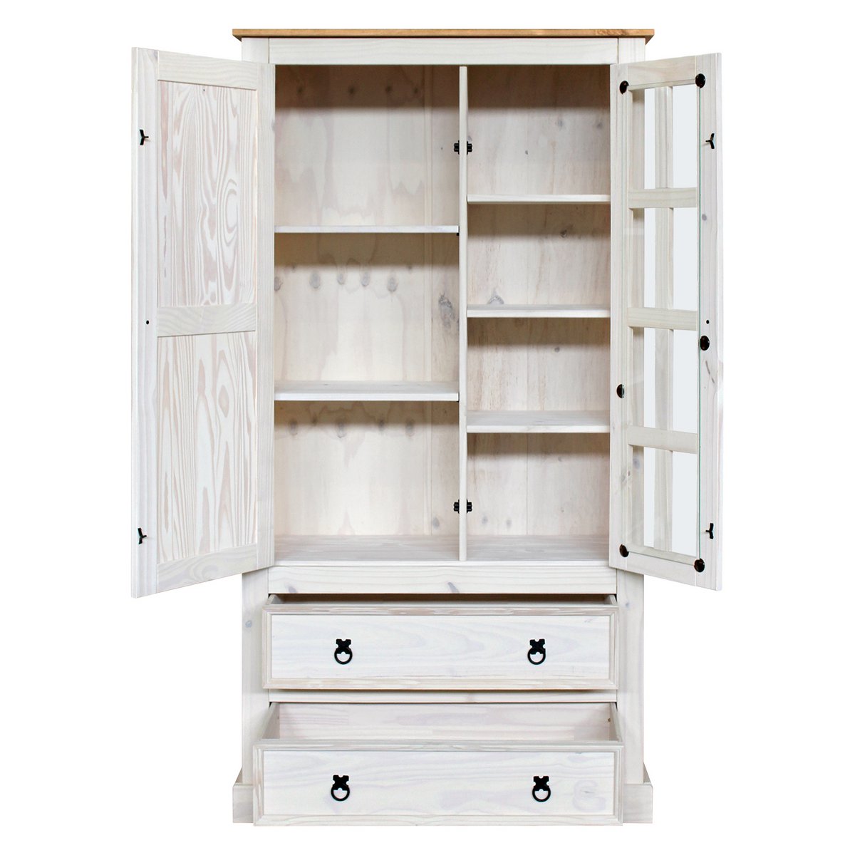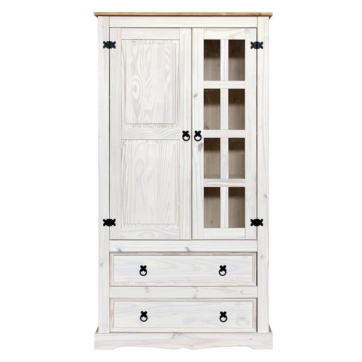 Deze grote vitrinekast houdt uw woonruimte stijlvol opgeruimd. Het is gemaakt van massief grenenhout. Achter de twee deuren, waarvan één met glas, is ruimte voor zowel decoratie als je persoonlijke spullen. In de twee lades met decoratieve metalen handgrepen kun je alles opbergen wat je niet meteen in het oog wilt laten springen. De vitrine creëert veel ruimte en een bijzondere sfeer die zorgt voor een prettig binnenklimaat.
