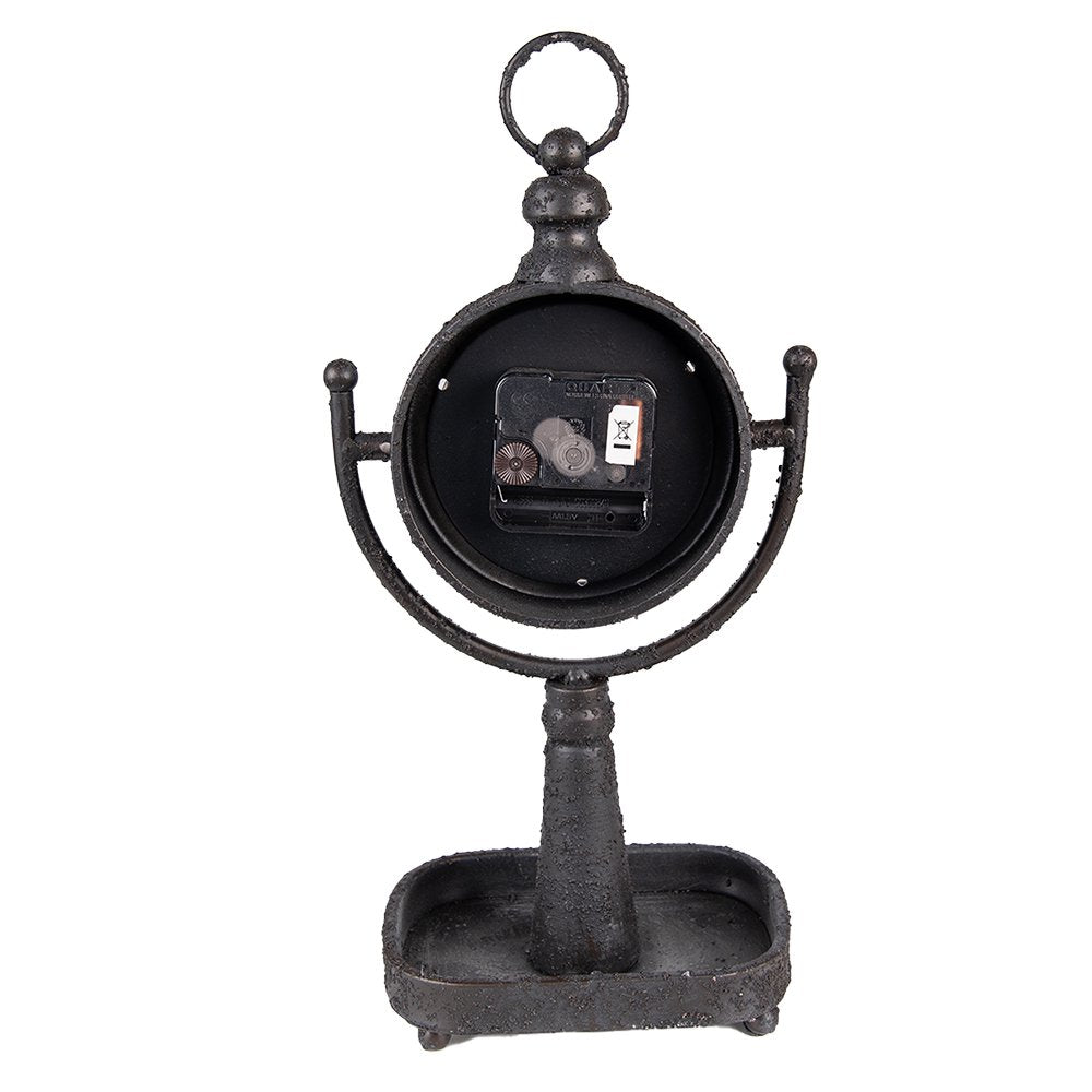 Mooie metalen industriële tafelklok met witte wijzerplaat en Romeinse cijfers, op een bakje van 15x11x2 cm als voet.