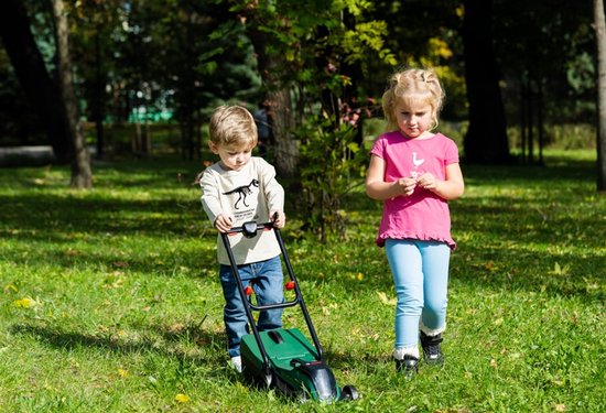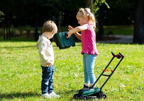 Theo Klein Bosch grasmaaier met ratel geluid. Afneembare opvangbak voor extra realistische speel ervaring.