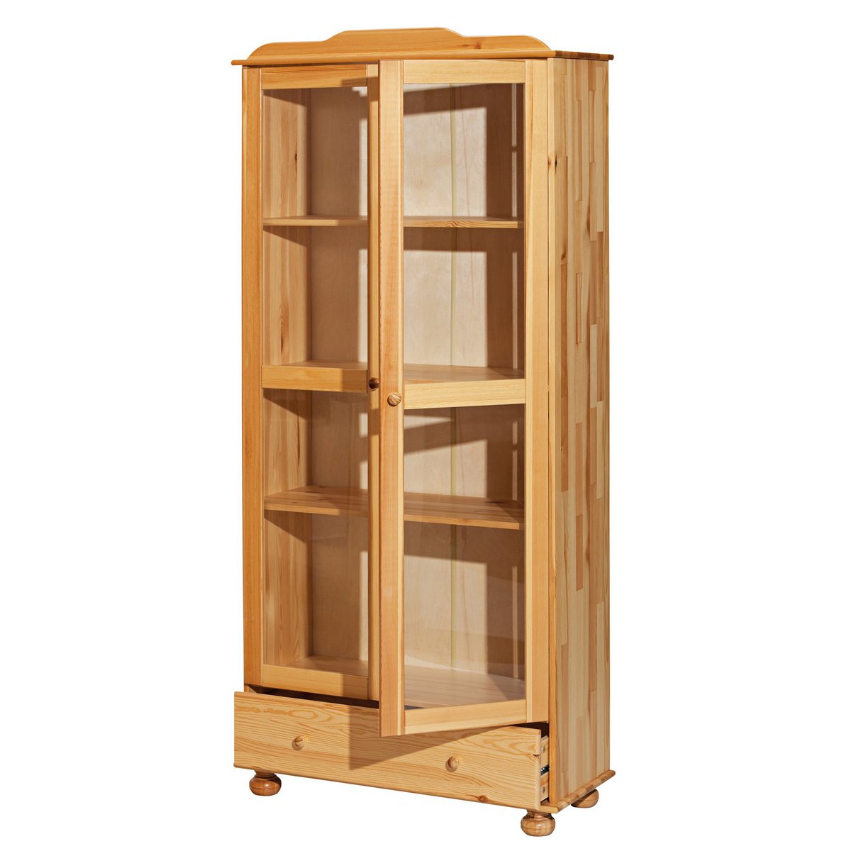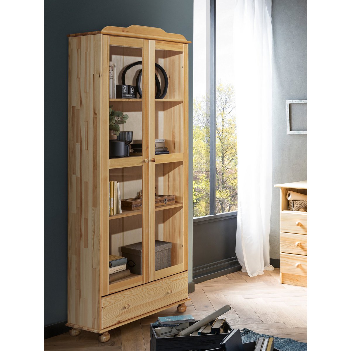 Deze grote vitrinekast met 2 deuren en 3 planken en een lade in de landelijke stijl zal uw spullen mooi tentoon kunnen stellen.