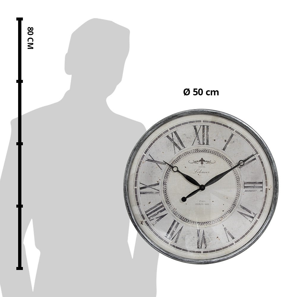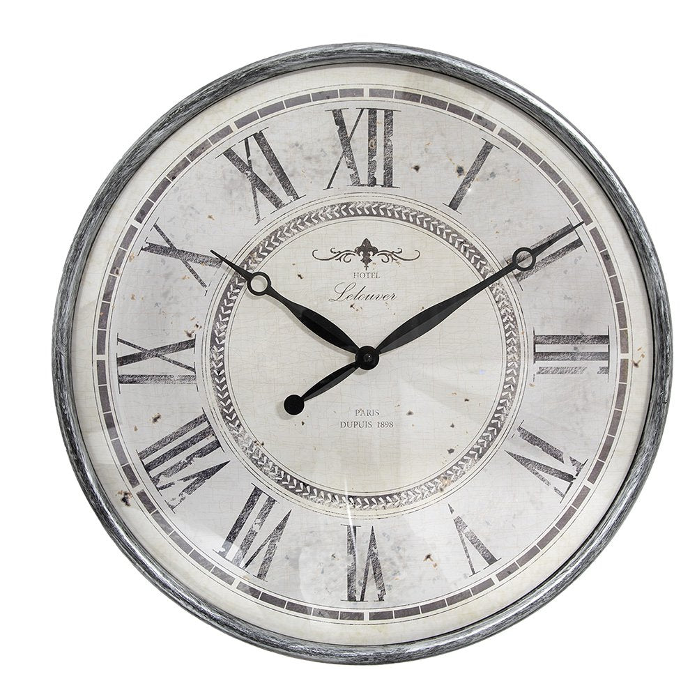 Decoratieve grijze wandklok in landelijke stijl.